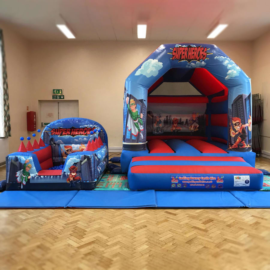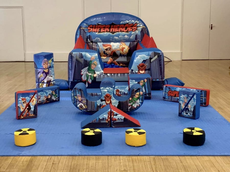 Our Superhero Bouncy Castle is only 10x14ft which is great for smaller halls. It is still super bouncy and has plenty of space for children to play and jump around. It has superhero artwork on the front arch and the back wall which keeps in theme with the soft play and ball pool. It has high walls making it difficult to climb.
