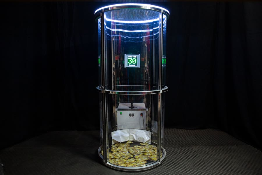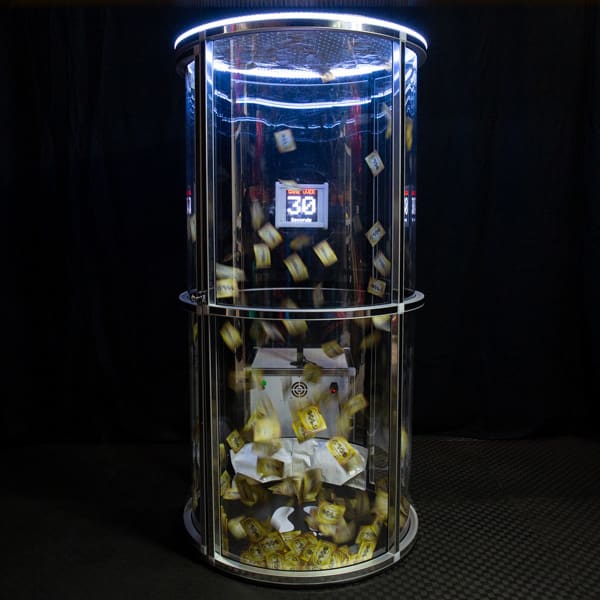 Step inside, activate the fans, and get ready for the cash-grabbing chaos! Participants have the chance to collect as much "cash" as possible as it swirls around them. Feeling creative? Substitute the fake cash with prize tickets or vouchers to tailor the excitement to your event. Want to add a twist? Introduce a single Golden Ticket or mix real money with fake bills to keep everyone guessing and engaged.