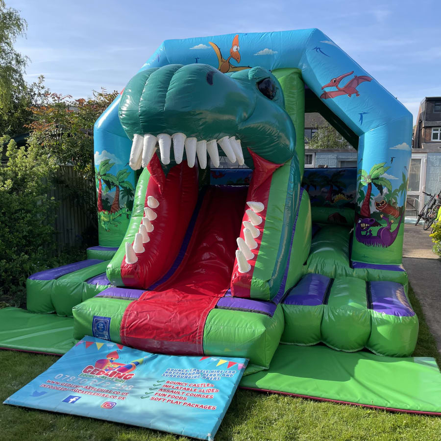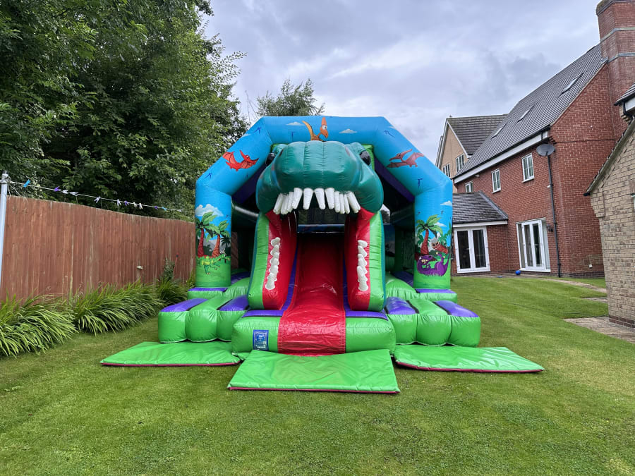 This superb Dinosaur Bounce and Slide Combi is perfect for children’s parties, school fun days, family BBQ’s or just for fun. It is available for hire in Nottingham, Derby & Leicester. Some of our local delivery areas include Arnold, Cotgrave, Gedling, Carlton, Lowdham, Gunthorpe, and West Bridgford. See all delivery postcodes here - delivery areas.