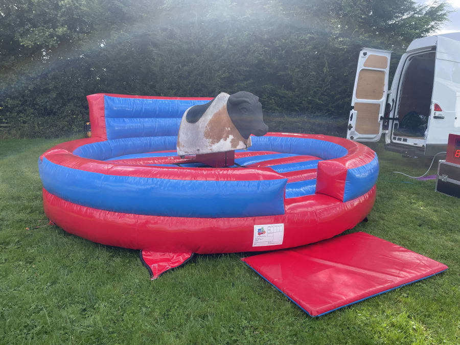 Ralph the Rodeo Bull is a deluxe version of rodeo bulls available and comes fitted with all relevant safety extras that are required. The rodeo bull is controlled by a trained member of our staff, during operation they will have to hold a button in order for the rodeo bull to buck and spin, the rodeo bull control box is also fitted with an emergency stop which will cut all power to the rodeo bull, when a member of our staff is not around to operate the rodeo bull this emergency stop will be activated and locked so the rodeo bull cannot operate. As standard, the bucking bronco comes supplied with an inflatable rodeo bull bed surround to cushion the landing when the rider falls. Safety matting is provided around the entrance to the rodeo bulls bed.