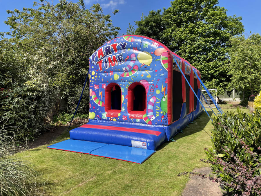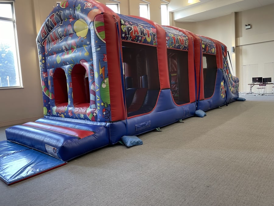 Our assault course has a sewn-in roof to protect from the rain or sun. It has fully netted side’s perfect for supervision. Safety mats are supplied as standard around the step and slide. For safety, you'll be given a booklet and wind meter for you to refer to for the duration of your booking.