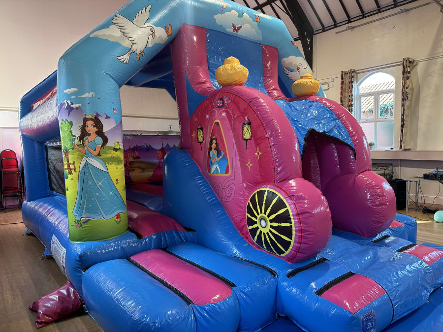 Our Princess Bounce and Slide is another of our new style of bouncy castle! Featuring a fantastic 3D Princess Carriage this inflatable is lots of fun and will be the talking point of your party! It is super fun and has a 5ft slide in the middle front facing along with a large bounce area for lots of bouncy fun!