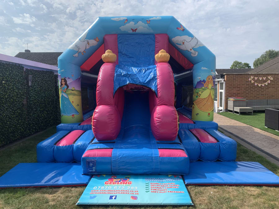 This magical inflatable is 13.5ft wide by 18.5ft deep, this will look great paired with our Princes Soft Play Sets! The large bouncy area allows up to 7 users to bounce at once and it also features a 5ft platform slide which adds much more fun!