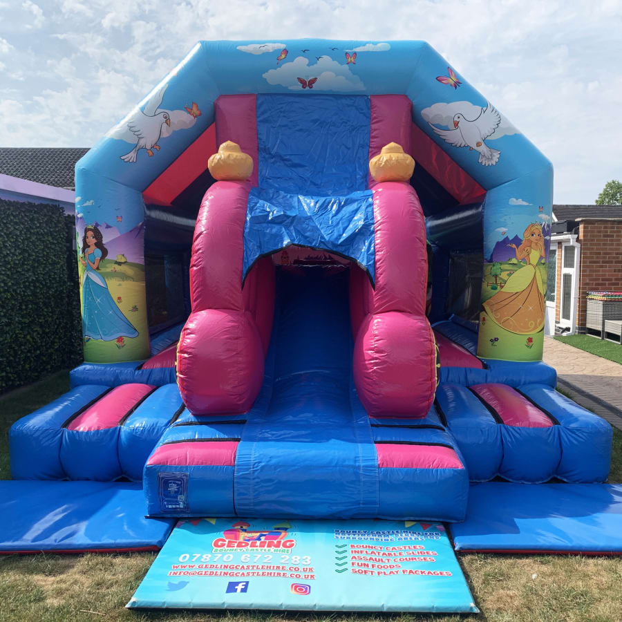 This pretty in pink Princess Bounce and Slide Combi is perfect for children’s parties, family BBQ’s, fun days or just for fun. It is available for hire in Nottingham, Derby & Leicester. Some of our local delivery areas include Arnold, Cotgrave, Gedling, Carlton, Lowdham, Gunthorpe, and West Bridgford. See all delivery postcodes here - delivery areas.