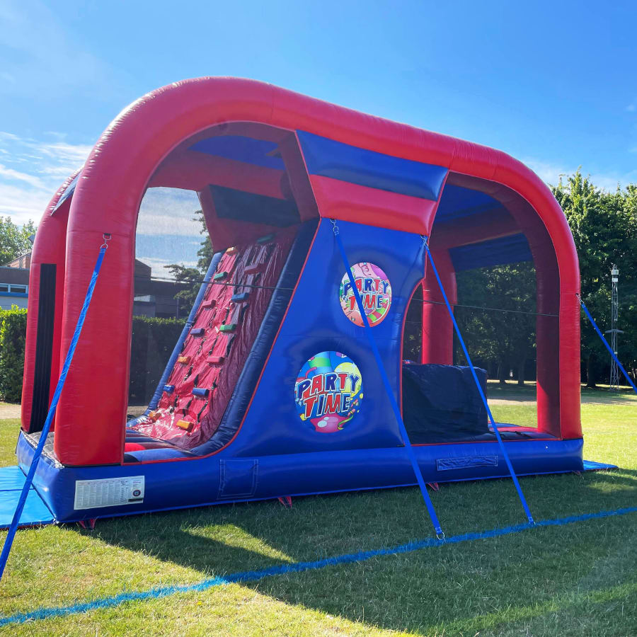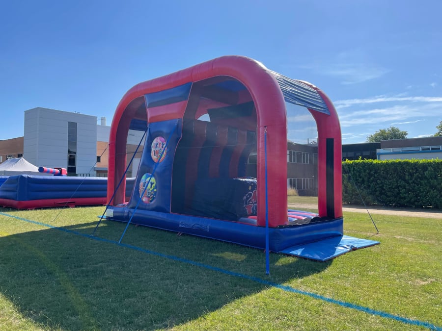 Our cliff jump comes with a fully trained operator to safely manage the inflatable for the duration of your event. Standard hire is 4 hours with additional hours available at extra cost. It does have a sewn-in roof cover to help protect from the rain or shine. With fully netted side’s spectators can cheer on from the outside. We provide safety crash mats at the exit.