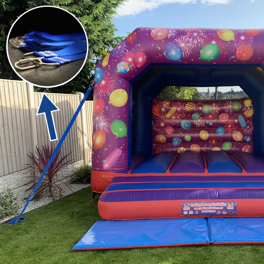 Our Guy Rope Anchor Straps are great replacements for ratchet straps or ropes for tethering high up anchor points. They are made from the same material of webbing and D rings bouncy castle anchor points are made from meaning the withstand the required 163 kg of force. Tethering straps should be anchored at a 45 degree angles. We make these straps in various lengths to cater for different inflatables where anchor points may be higher or lower than others. The straps come equipped with a D ring at either end and a quick link at one end to attach the strap to the inflatable. The quick links are also rated above the minimum breaking strain required. We also can add extra D rings to the peg end of the strap to allow for adjustment where the 45 degree angle isn't possible, this would be additional cost.