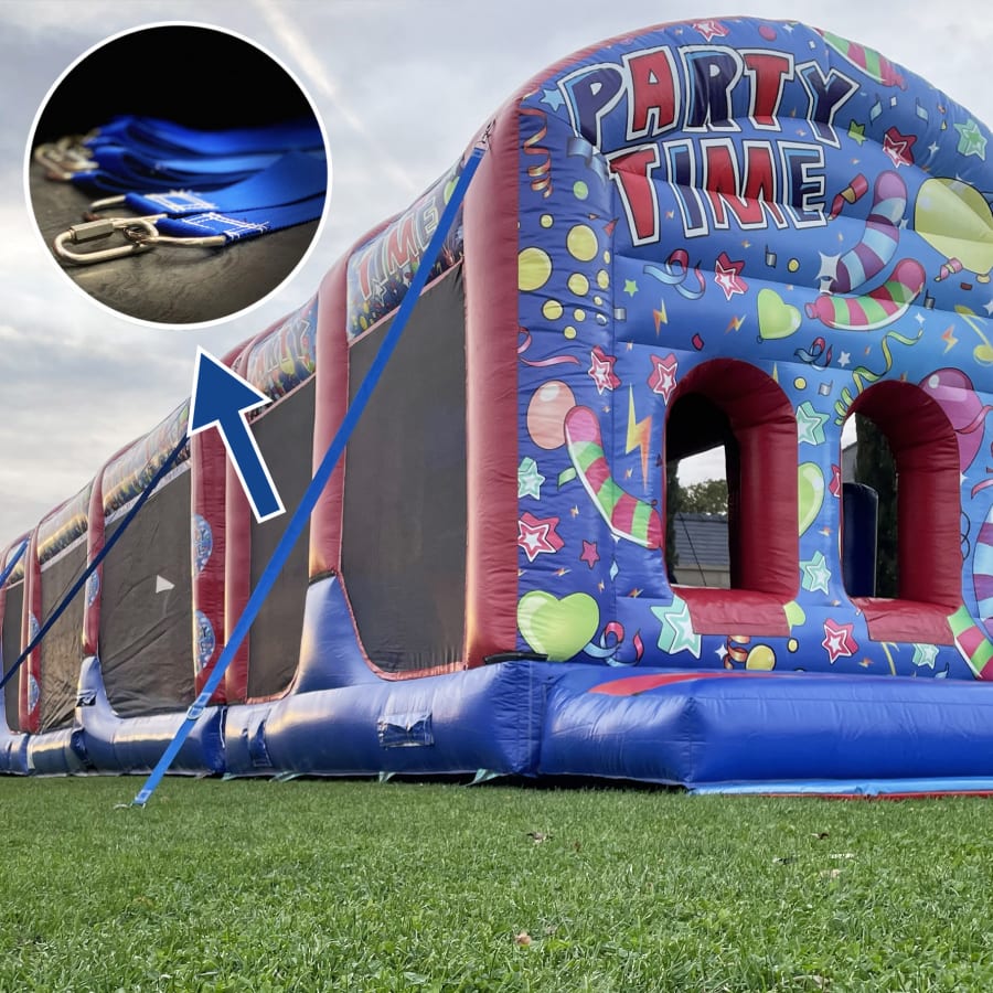 Our Guy Rope Anchor Straps are great replacements for ratchet straps or ropes for tethering high up anchor points. They are made from the same material of webbing and D rings bouncy castle anchor points are made from meaning the withstand the required 163 kg of force. Tethering straps should be anchored at a 45 degree angles. We make these straps in various lengths to cater for different inflatables where anchor points may be higher or lower than others. The straps come equipped with a D ring at either end and a quick link at one end to attach the strap to the inflatable. The quick links are also rated above the minimum breaking strain required. We also can add extra D rings to the peg end of the strap to allow for adjustment where the 45 degree angle isn't possible, this would be additional cost.