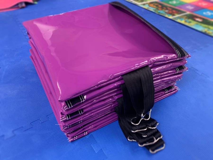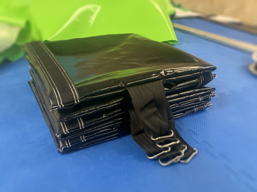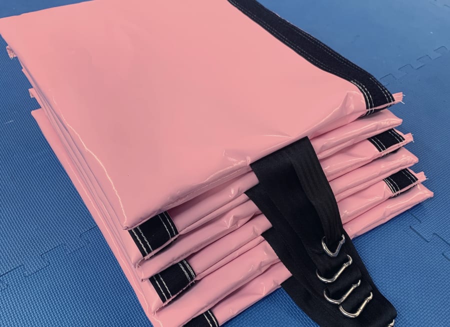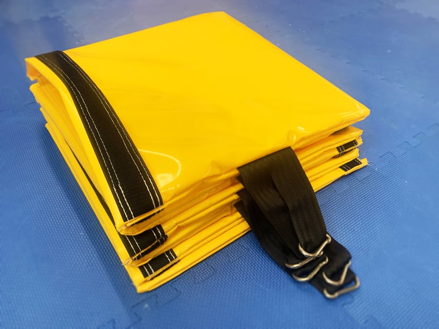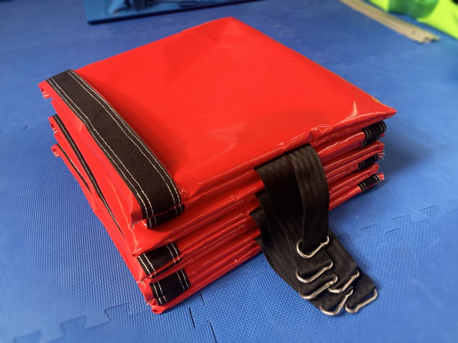 Our sandbags are designed to weigh down inflatables for indoor use, the sandbags are made out of 610 gsm PVC with a 2-inch heavy duty webbing strap long enough for ease of carrying. Our sandbags have internal seems to improve the strength and remove sharp edge. We also use top quality strong velcro so the bags stay shut and each sandbag has a stainless steel carabiner clip to secure to sandbag to the D ring on the anchor point of the inflatable.