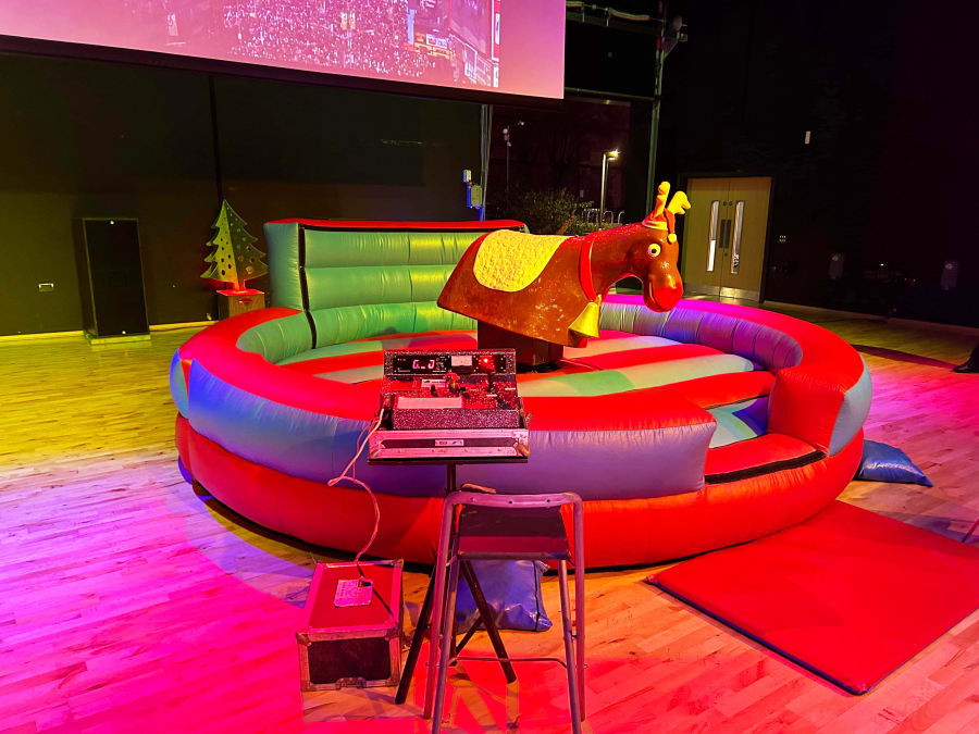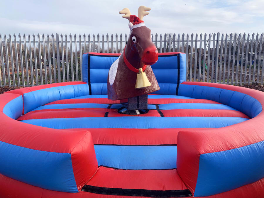 Rudolph the Reindeer has a lovely Santa hat on his antlers and is fitted with all safety features such as a dead man’s handle which is an automatic cut off wristband meaning as soon as you fall the ride cuts out and Rudolph stops moving. The inflatable bed surrounding the rodeo reindeer is there to cushion your fall and safety mats are provided at the entrance to the bed.