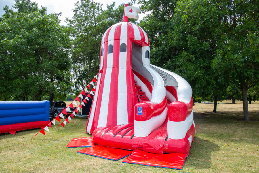 This fantastic helter skelter is red and white themed making it perfect for fun fair themed events! The helter skelter is suitable for children and adults alike and a real crowd pleaser for all events! We provide safety mats as standard along the front edge of the inflatable helter skelter. All bookings will be given a safety book to refer to and outdoor bookings will also receive a wind meter for you to monitor the wind speeds duration of your booking.