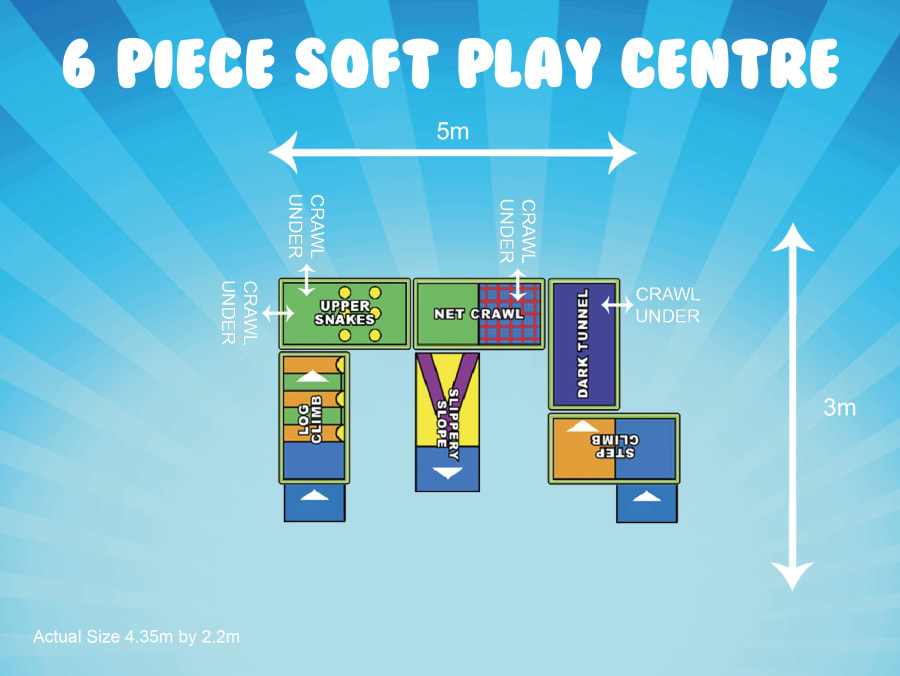 Our 6 Piece Soft Play Centre is made up from 5 play pods and a slippery slide. The centre provides lots of fun and features 5 crawl under entrances/exits for children to explore.