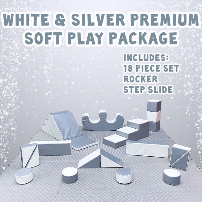 Looking for the perfect soft play set to make your little one's birthday party a hit? Look no further than our White & Silver Premium Soft Play package! This package includes our 18 Piece Basic Soft Play Set, along with the addition of our Rocker and Step and Slide. It's the ideal option for children under 5 and will keep them entertained for hours!