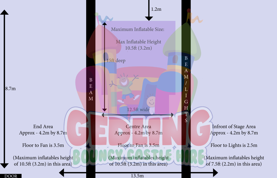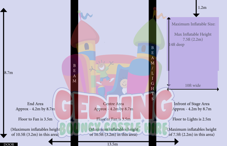 We only recommend our Basic, Premium & Deluxe Soft Play on the carpet area. All inflatables must be in the main hall due to safety space.