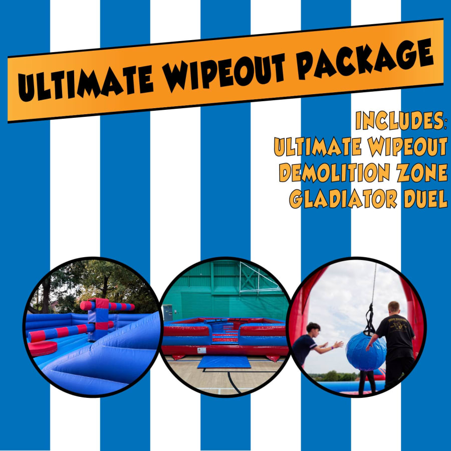 Prepare for an unforgettable adventure with our Ultimate Wipeout Package, the perfect blend of excitement and competition. This package promises three hours of exhilarating fun, featuring the Gladiator Duel, Wrecking Ball, and Ultimate Wipeout. Whether you're planning a birthday party, a corporate event, or just a fun day out, this package is designed to deliver high-energy entertainment for everyone aged 10 and above.