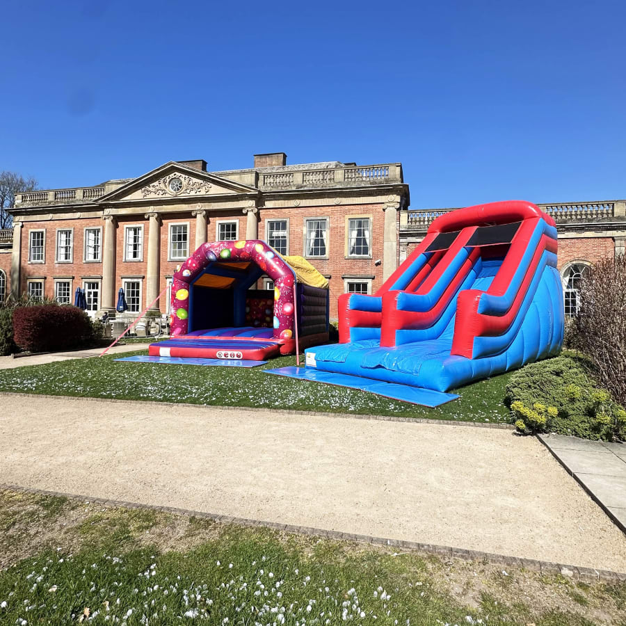 The bouncy slide stands at a whopping 20ft high so cannot be missed, it’ll pull a crowd from all over. Our bouncy castle stands at 12.5ft so will look great next to the slide. The bouncy castle has high walls to prevent children from climbing and is fitted with a rain cover. Our slide has sewn in handles to assist with the climb and its celebration theme makes it perfect for all occasions.