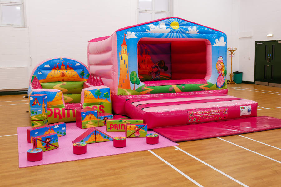 This package has a bright pink theme that features princesses and princes. The pink soft play balls keep the theme matching and float up high on the air mountains of the ball pool. The low entrance makes it easy for smaller uses to get in and out. Our bouncy castle has a large bed for extra bouncing space and is only 7.5ft tall so perfect for low height venues.