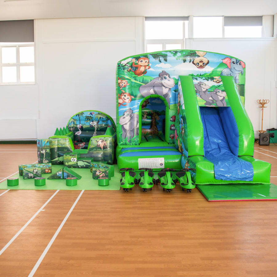 This premium party package is supplied with safety mats all around. The Jungle Bounce & Slide Combi features an impressive 5ft platform and has a fully enclosed bounce area to promote user safety, the Jungle Air Juggler Ball Pool has super bright green soft play ball to tie in with the jungle theme and has 8 air cones attached a nice additional game to play with the ball pool. The Jungle Soft Play features some creative shapes for children to explore and get creative, and the didi cars are great entertainment for any slightly older children at the party