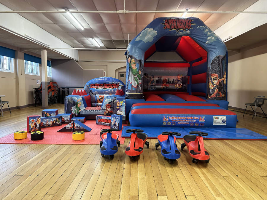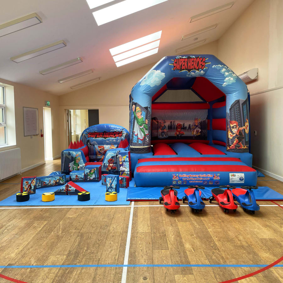 This brilliant package contains our Superhero 18 Piece Soft Play set up on foam mats with a double rocker, Superhero Air Juggler Ball Pool, Superhero Bouncy Castle and 4 Didi Cars. It is the perfect combination of equipment for your little superhero’s as they can jump as high as the sky liners and fly around! Ride the Batmobile on the didi cars and duel all the villains on to get to the safe zone in the soft play balls.