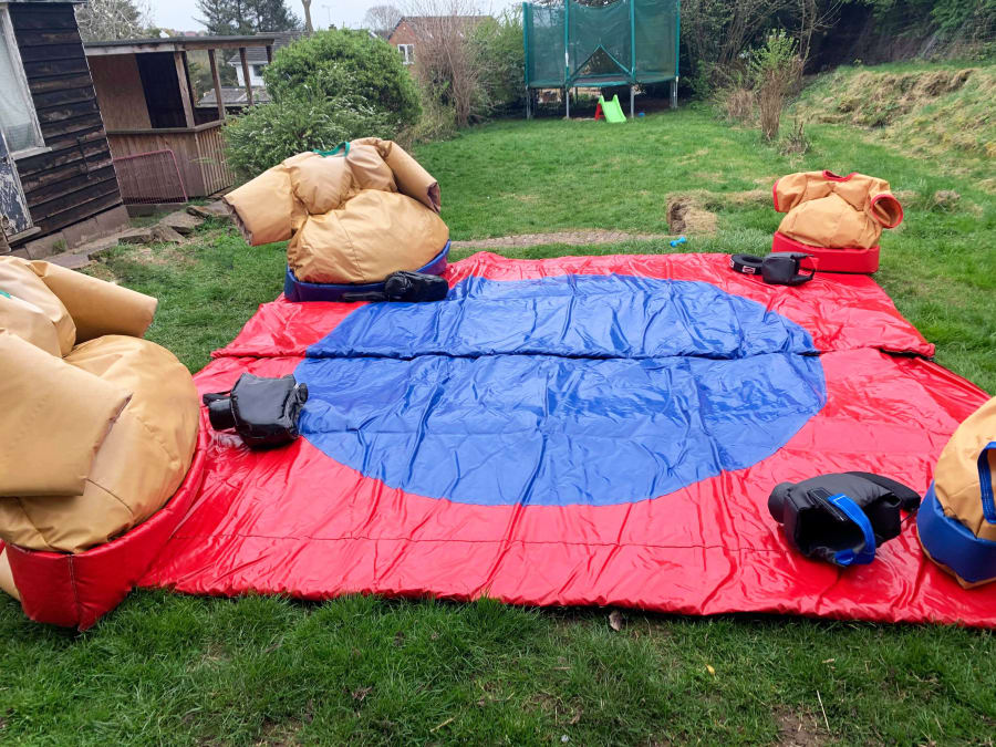 Our family set of sumo suits includes 2 children's suits, 2 adults suits, 4 neck braces and 4 sumo wrestler style safety helmets and one crash mat. These are great fun for family get-togethers, family orientated events and fun days! This is a great competitive garden game and will ensure to bring some thrills to your party.