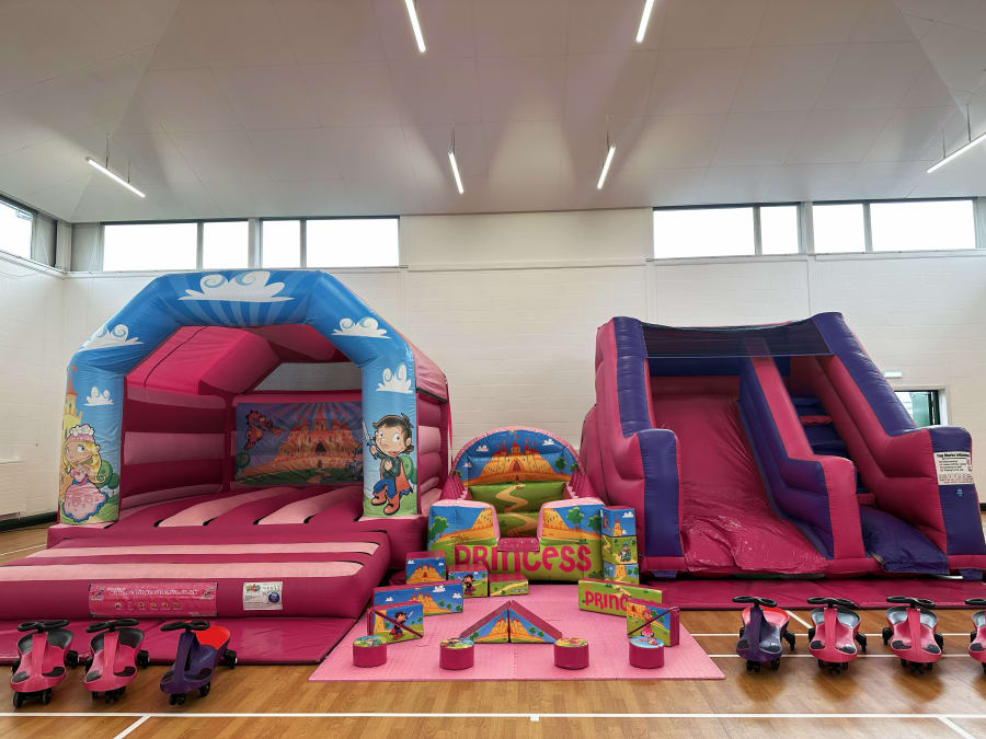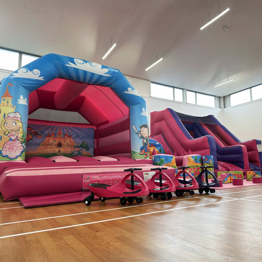 This is one of our best party packages and is supplied with safety mats for each inflatable. The bouncy castle has a large bed for extra space when bouncing as well as high walls to help avoid children from climbing them. The package also comes with our impressive Pink and Purple 6ft Platform Slide, our Princess Ball Pool which comes with matching pink soft play balls and has 8 air juggler cones that the balls float on which really adds a ‘WOW’ factor to your party! The Soft Play is great for the imagination and creative children as they can explore the shapes and run wild. Finally, the Didi Cars are great entertainment for any slightly older children at the party!