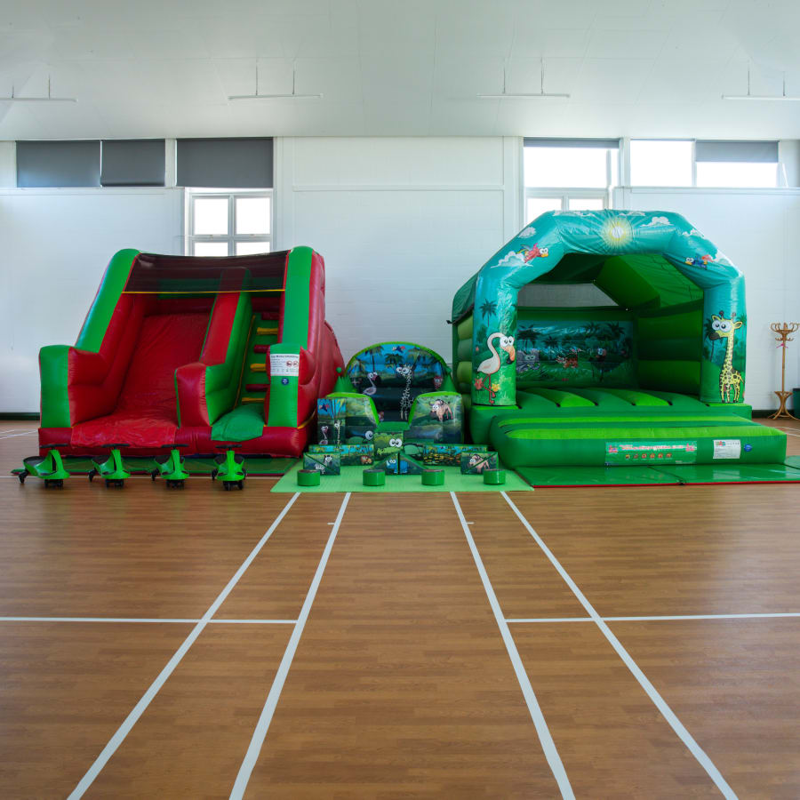 This is one of our very popular party packages and comes supplied with safety mats for each inflatable. The box castle is great for the younger children as it’s bump stops them from rolling out. The package also comes with our impressive Red/Green 6ft Platform Slide, our Jungle Air Juggler Ball Pool which comes with matching green soft play balls and has 8 air juggler cones that the balls float on as well as our Jungle Soft Play which is perfect to let the imagination run wild. Finally, the Didi Cars are great entertainment for the slightly older children at the party!